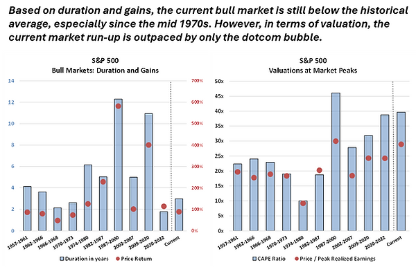 Compared to past bull markets – which are arbitrarily marked by periods following drawdowns of at least 20% – the current rally is still below average in terms of duration and gains; however, in terms of valuations, only the dotcom bubble surpasses it. The US stock market has arguably been in one long cyclical bull market since 2009, much like the run in the market from the early 1980s to the peak in 2000.